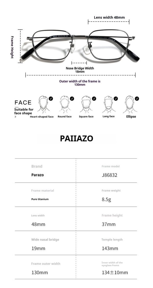 PAIIAZO J86832 eyewear redefines daily wear with minimalist design and superior craftsmanship. Crafted from pure titanium, the entire frame weighs only 8.5g, offering feather-light comfort for all-day wear. The wide nose pads and flexible temple arms are designed to perfectly fit Asian facial contours, ensuring long-lasting support without pressure. Choose from a variety of functional lenses to suit any scenario—be it work, commute, or leisure—for clear vision and eye protection.