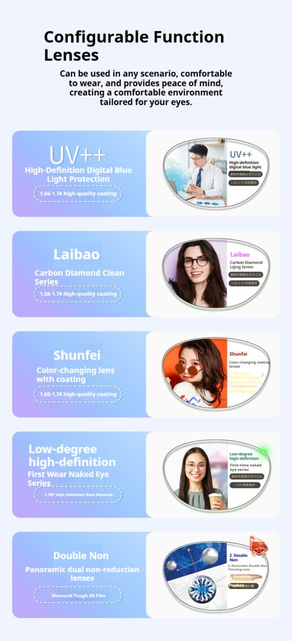 - Lenses: Compatible with UV++ blue light filtering, photochromic, low-prescription HD, and other functional lens options